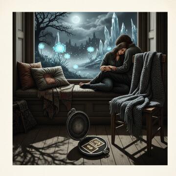 A giant heart-shaped tree in the middle of a serene, mystical forest. The heart is made of intertwined branche