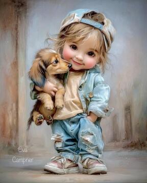 Ein bund kitschiges (aber schönes) Hundebild (eine art Collage) mit vielen Elementen. Doodle. Deutscher Text