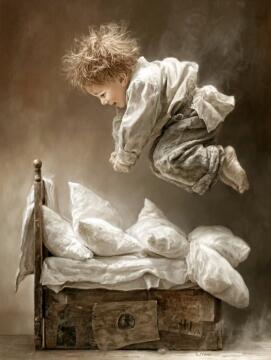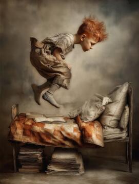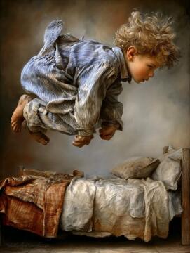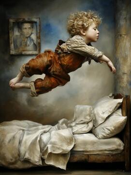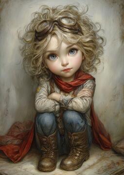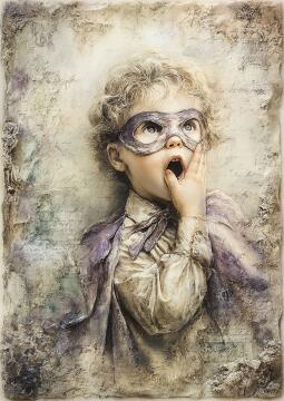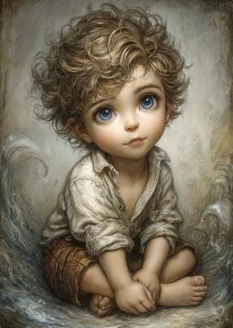 Erstelle ein Bild, das eine lebendige Szene eines Jungen mit schwarzen Haaren und leuchtend großen Augen in e
