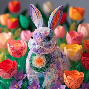 A beautiful 3D paper craft scene of a spring garden. Everything is made of colorful curled paper strips (quill