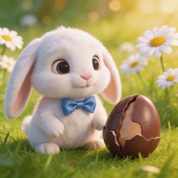 An adorable, fluffy baby bunny wearing a tiny blue bowtie, sitting next to a cracked chocolate egg. Pixar-styl