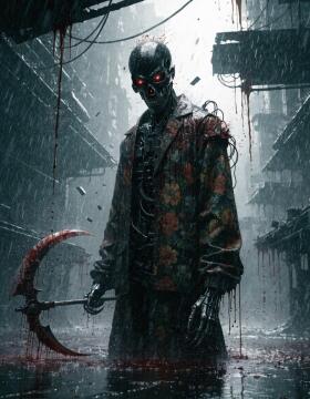 A cyborg reaper clad in a floral-patterned jacket stands amid a blood-soaked backdrop,