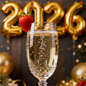 Macro shot of a premium crystal champagne flute. A strawberry is perched on the rim. The bubbles in the drink