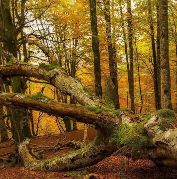 A creepy haunted forest under a violent thunderstorm, with ancient twisted trees swaying in the wind, lightnin