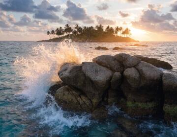 Eine süße, kleine Katze, mit einer Sonnenbrille, sitzt am Strand, umgeben von Palmen