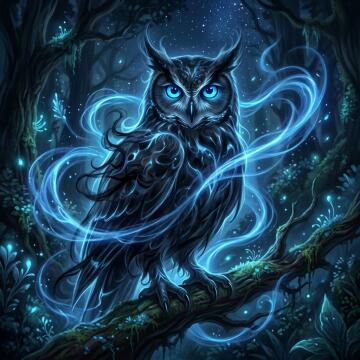 Transparente gespenstische schwarze Eule, zwei blaue freundliche Augen, blaue gespenstische Wirbel rundherum,