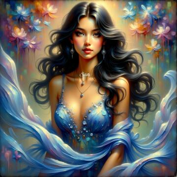 Ein wunderschönes Mädchen mit langen Haaren im Avatar-Stil. Ich bade mitten in einem Wald voller Blumen, hal