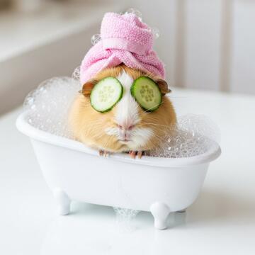 A pampered guinea pig relaxing in a miniature white bathtub filled with soap bubbles. It has two tiny cucumber