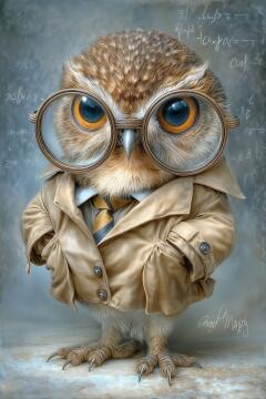 Transparente gespenstische schwarze Eule, zwei blaue freundliche Augen, blaue gespenstische Wirbel rundherum,