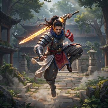 Ein detailliertes Charakter-Konzept eines "Krieger-Mönchs". Er trägt eine Mischung aus Seidenroben