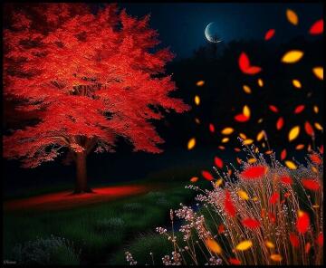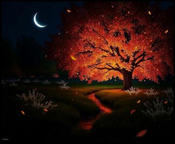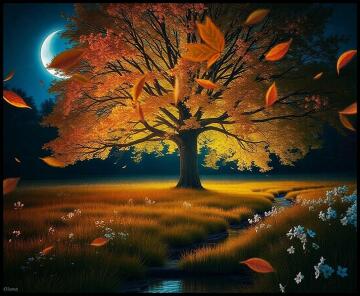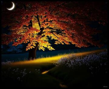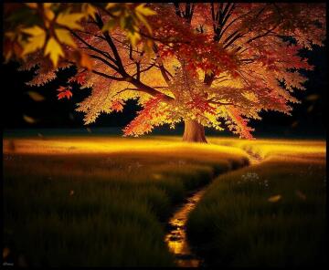An ancient wooden bridge blanketed with fallen leaves, leading into a mystical forest glowing with ethereal li