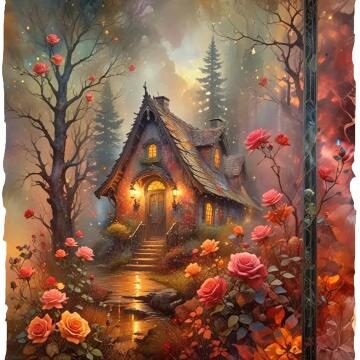 Ein Foto eines Hauses im Wald, Fantasiehaus, gruseliges Schloss, mystisch, schönes Haus auf einem Waldweg, vo