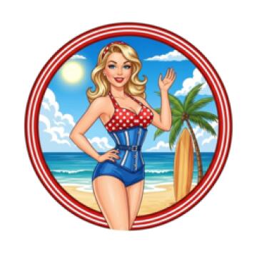 Eine hübsche Frau steht in einem knappen Bikini an einem Strand, Sonnenuntergang im Hintergrund, großes Deko