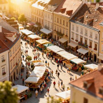 Eine Tilt-Shift-Aufnahme eines belebten Marktplatzes in einer europäischen Altstadt von oben. Die Menschen un