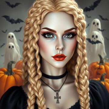Schöne Dame (Sommersprossen), breites Lächeln, rubinrote Augen, kurzes Haar, dunkles Make-up, hyperdetaillie