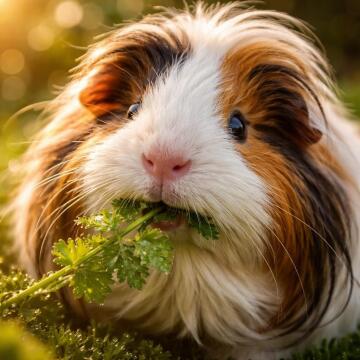 Hyper-realistic close-up macro shot of a Peruvian guinea pig nibbling on a fresh, dew-covered sprig of parsley