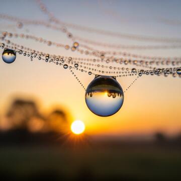 Ein hyperrealistisches Makrofoto eines Tautropfens auf einem Spinnennetz, das die Welt kopfüber spiegelt. Son