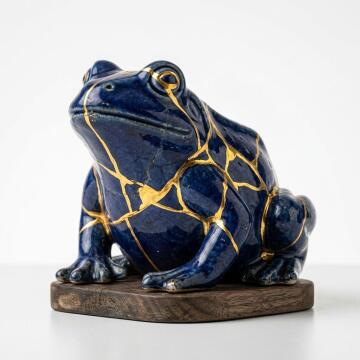 A beautiful, sophisticated art portrait of a ceramic frog sculpture that has been broken and repaired using th