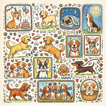 Ein bund kitschiges (aber schönes) Hundebild (eine art Collage) mit vielen Elementen. Doodle. Kein Text