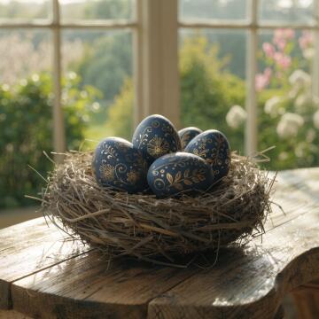 A high-quality, close-up shot of a rustic wooden table with a nest made of dried grass. Inside the nest are fi