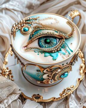 Transparente gespenstische schwarze Eule, zwei blaue freundliche Augen, blaue gespenstische Wirbel rundherum,