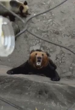 Orange/schwarzer flauschiger Katzen-Ninja, betrunkene Faust, Kampfhaltung, hoher Tritt, Spagat, vor Hundemenge