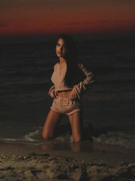 Eine hübsche Frau steht in einem knappen Bikini an einem Strand, Sonnenuntergang im Hintergrund, großes Deko