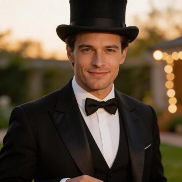 Hübscher Mann, Smoking, Zylinder, Abendkleidung, realistisches Foto, natürliche Farben, natürliche Beleucht