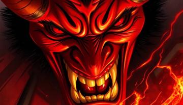 A skull with a wild, toothy grin that stretches from ear to ear, wearing a clown wig and oversized red nose, c