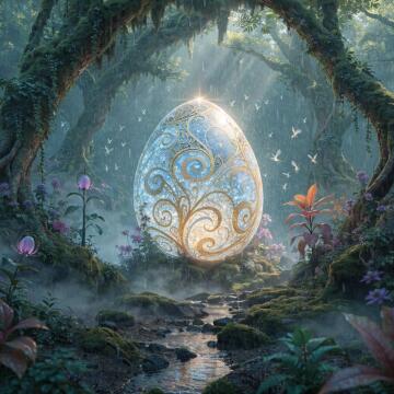 A giant, glowing magical Easter egg hidden deep within an enchanted forest. Bioluminescent plants surrounding