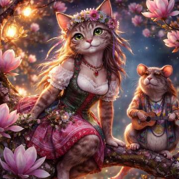R3mbr4ndt, Ölgemäldeporträt eines bärtigen Mannes, der ein Vogelnest als Kopfbedeckung trägt, mit Katzen
