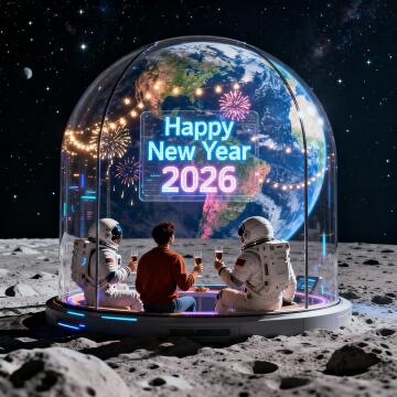 View from inside a glass observation dome on the Moon surface. Astronauts in casual futuristic clothes are hol