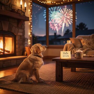 A cozy, warm living room scene. A crackling fireplace. A fluffy golden retriever puppy sitting on a rug lookin