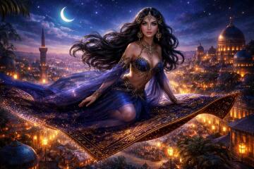 Eine Illustration eines Rentiers, das durch den Sternenhimmel fliegt, mit leuchtenden Sternen und dem Mond im