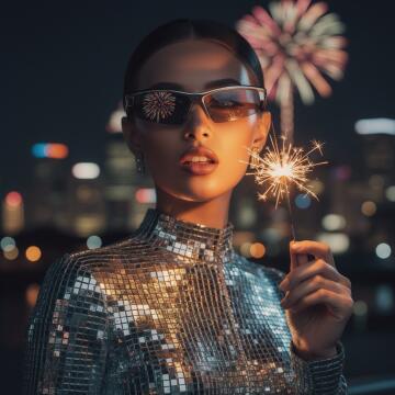 Fashion portrait of a woman wearing a sparkling, avant-garde silver dress made of mirrors. She is wearing futu