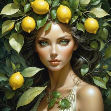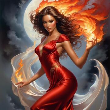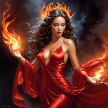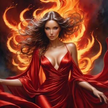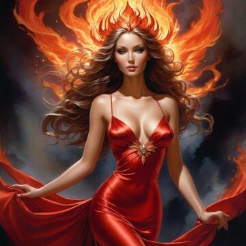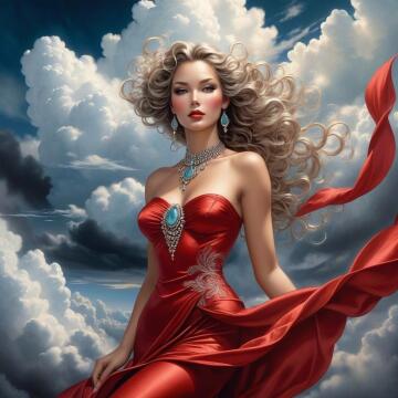 A commanding woman with a very large bust, wearing a gladiator-inspired bikini, stands in the center of an anc