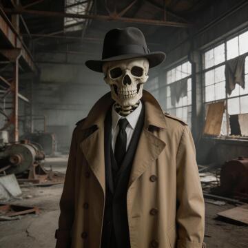 A skeleton wearing a 1920's trenchcoat, suit and tie, fedora hat, great depression vibes, abandoned facto