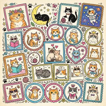 Ein bund kitschiges (aber schönes) Katzenbild (eine art Collage) mit vielen Elementen. Doodle. Kein Text