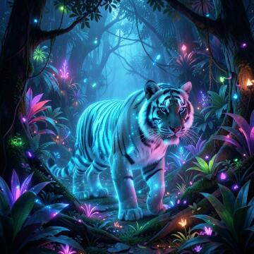 A bioluminescent tiger in a futuristic jungle, its stripes glowing in the dark, with trees and plants also emi