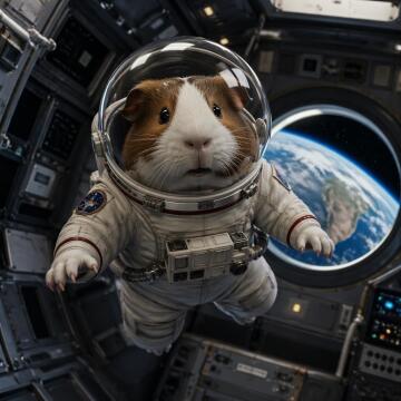 A guinea pig as an astronaut, floating inside a spaceship cabin. It wears a detailed white space suit with a g